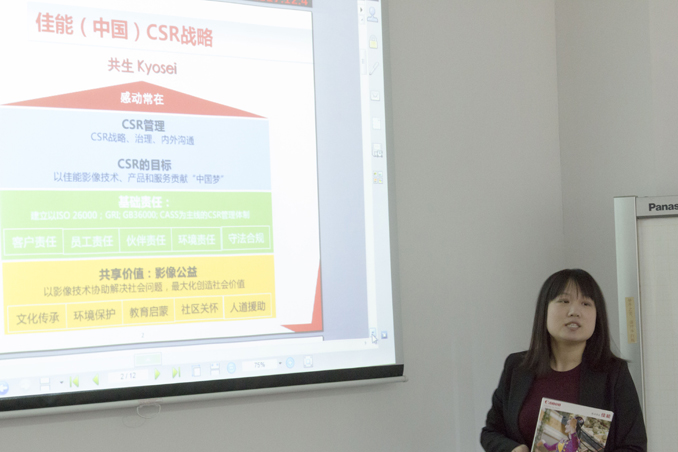 结束了对快修中心的参观后,涉外公共关系部门、人事部门和环境部门的员工分别对社会公益活动、人事制度和环境战略进行了介绍。在涉外公关系部门工作的谭冬琦刚刚编写了《佳能(中国)企业社会责任报告2016-2017》。这份90页的报告详细介绍了佳能(中国)有限公司在2016-2017年在中国开展的一系列公益活动。谭冬琦介绍道,佳能在公益事务上一直很活跃。从非物质文化遗产保护到用影像发现丝路之美,从资助希望小学到教授贫困地区小朋友如何拍照,以及助力“地球一小时”,开展社区关怀活动,为地震灾区提供人道援助等等,佳能一直致力于用多种渠道发挥企业的社会责任。