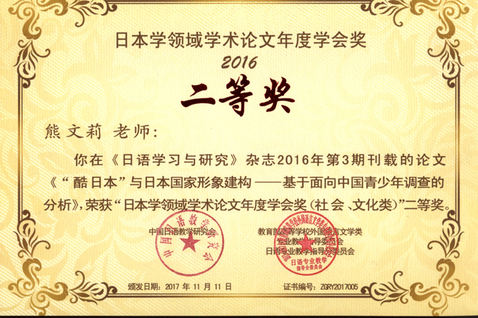 日语系熊文莉副教授在《日语学习与研究》杂志2016年第3期刊载的论文《“酷日本”与日本国家形象建构—基于面向中国青少年调查的分析》,荣获“日本学领域学术论文2016年度学会奖(社会、文化类)”二等奖。论文通过杂志推荐、个人自荐的方式参选,经初审、复审、终审三个阶段的匿名评审,最终选出语言类、文学类、社会文化类三组一等奖、二等奖、三等奖各一名。(日语系 孙晓英)
