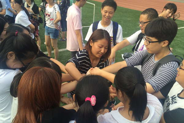 最后,同学们回到了操场完成最后一个游戏。六、七名同学围成一个圈,每个人的手交叉放置并拉住另外一名同学的手,之后通过一系列转身换位最终还原成一个圆圈。这个游戏考验了同学思维能力和团队协作精神。