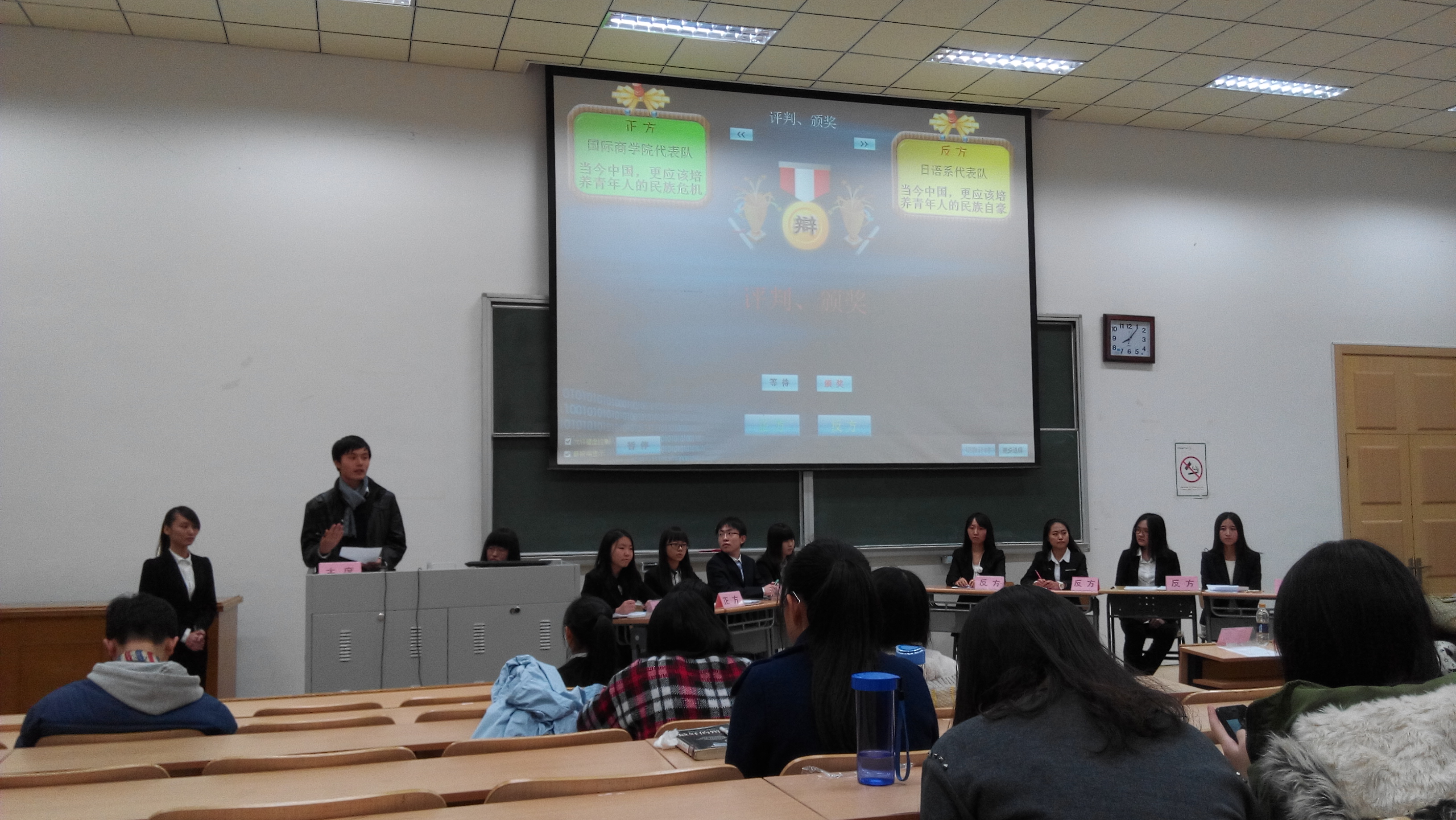 11月21日晚7点,校辩论赛半决赛——日语系与国际关系学院的对决在十二大准时举行。本次辩论赛的辩题为“应当培养青年人的民族危机感还是民族自豪感”,国际关系学院为正方,日语系为反方。经过正反双方的精彩对决,最终日语系惜败于国际关系学院,获得第三名。