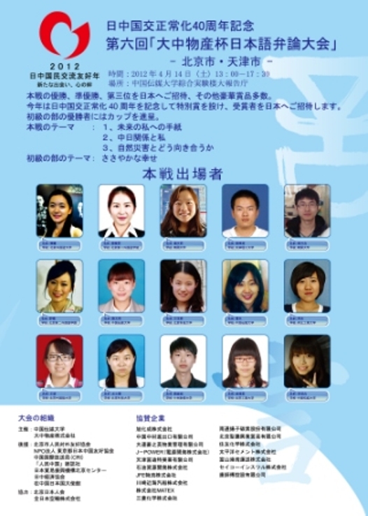 4月14日,我校日语系王新、陈曦同学在北京传媒大学举行的“中日邦交正常化40周年纪念—第6届大中物产杯日语演讲大赛”中,分别取得了第一、二名的优异成绩。此次演讲比赛吸引了全国25所高校、约150名选手报名。我校日语系大一王新和大三陈曦两位同学因表现出色,顺利进入决赛并取得前两名的好成绩。