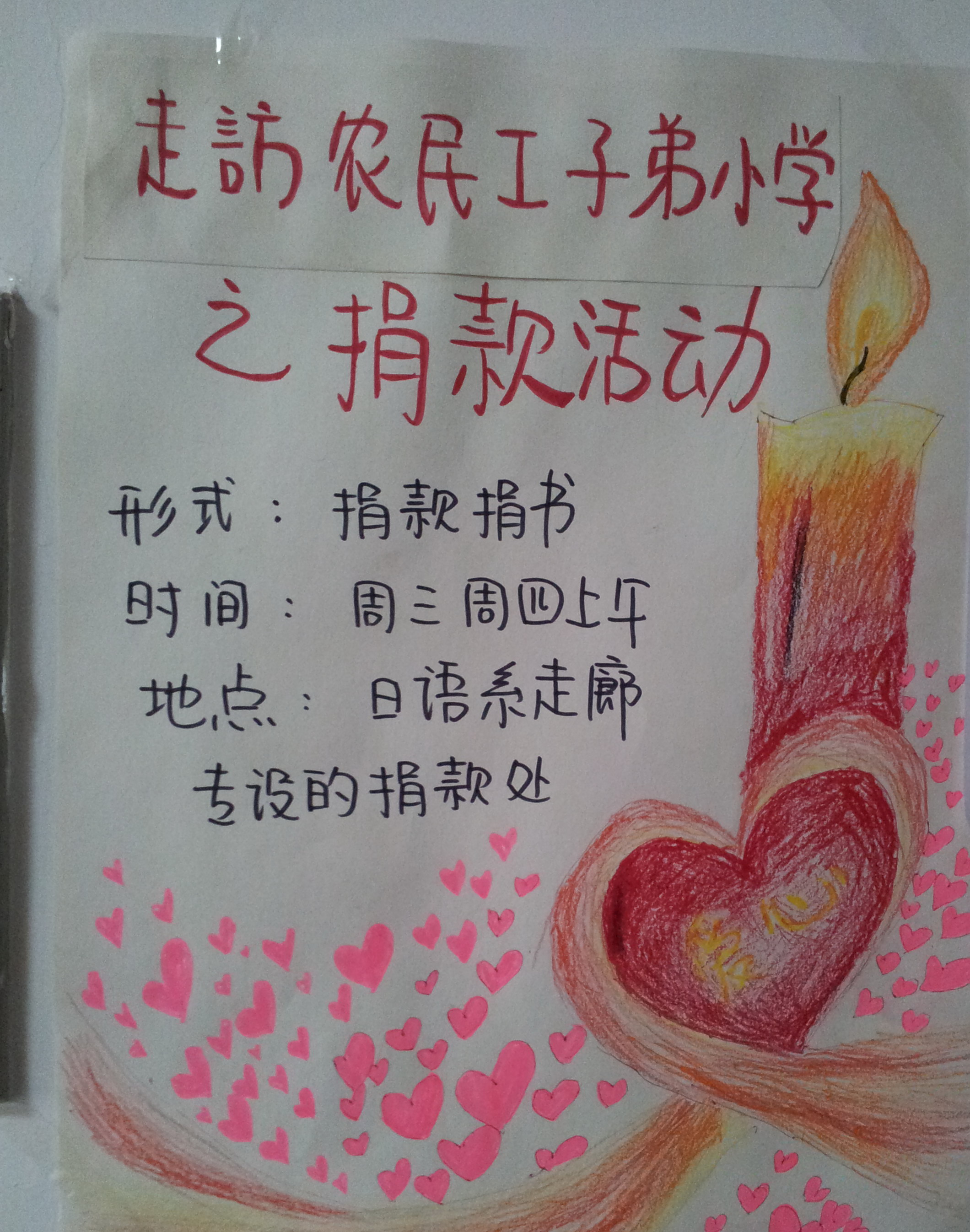 小天鹅学校地处北京郊区,条件非常简陋,学习环境很差。而这些孩子们的父母整天为生活奔波,无暇给予孩子们足够的关爱。这次日语系举办的这次活动就是希望大家能够给予这个群体更多地关注。