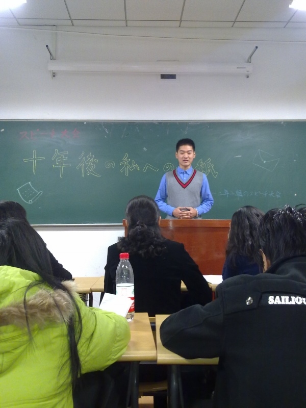 本次演讲比赛题目为“给十年后自己的一封信”,要求围绕题目进行800字以内的演讲。评分标准为文笔、语言流畅度、熟练程度、感情表达等。选手们在台下做好了充分准备,个个信心十足。二年一班黎敏同学从自身经历出发、感人至深的演讲赢得了台下老师同学们的热烈掌声。参赛选手有的以歌言志、有的极富技巧,他们落落大方的身姿、清晰标准的发音、自信而情感充沛的演讲无不给现场观众留下了深刻印象。最后经统计,日语系评选出一等奖两名,分别为丛颖、宋轶洋;二等奖四名,分别为战健、黎敏、罗盈、赵玮琳;三等奖六名,他们是过栋、徐斌、原炜迪、胡南夫、万靖宇、石鸿藻。颁奖及总结环节在各班分别进行。