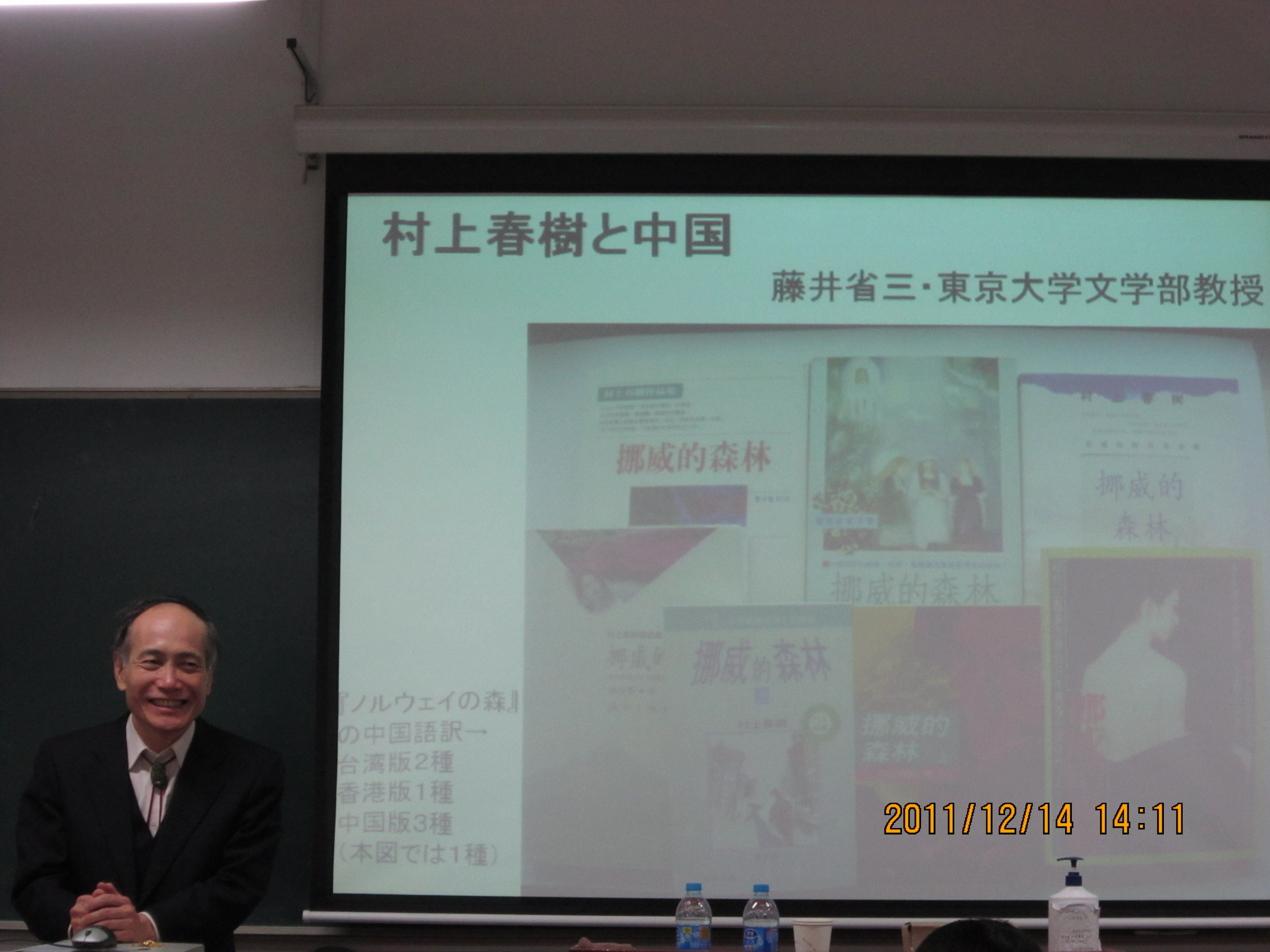 12月14日下午2点,东京大学藤井省三教授在主楼404教室为日语系同学们进行了主题为“村上春树与中国”的讲座。讲座吸引了很多日语系师生,整个教室座无空席。