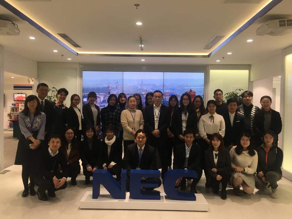12月10日下午,日语系戴秋娟老师、李丰老师带领选修现代日本经济课的学生参观了位于朝阳区外交办公大楼的日电(中国)有限公司(NEC)。本次活动是中国日本商会、日本国驻华大使馆共同主办的“对话日企 共同探索活动”之一。