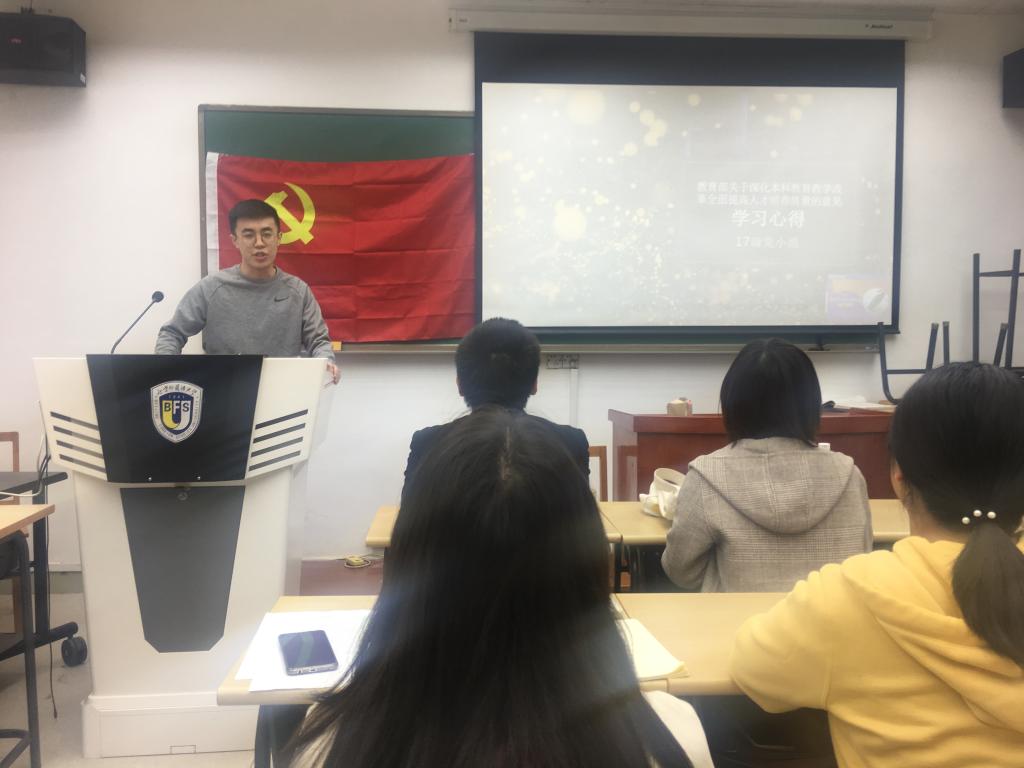 10月16、17日,本科生党支部以党小组为单位,集体学习了《教育部关于深化本科教育教学改革全面提高人才培养质量的意见》、《习近平在教育大会上的讲话》、《习近平在全国高校思想政治工作会议上的讲话精神》等重要文件。10月25日,支部召开主题党日活动,各小组派代表上台分享学习心得,表示作为高校学生党员,大家必须维护党对教育工作的领导,积极配合教育事业的各项改革。支部成员表示,在本科阶段的学习中,不仅要认真学习专业课课程,还要利用好学校里的选修课资源,把选修课的学习和专业知识有机结合,让其发挥出应有的成效。作为学生党员应该刻苦学习,带头重视思政课的学习,平衡好专业课、方向课、选修课的关系,做复合型、复语型人才。