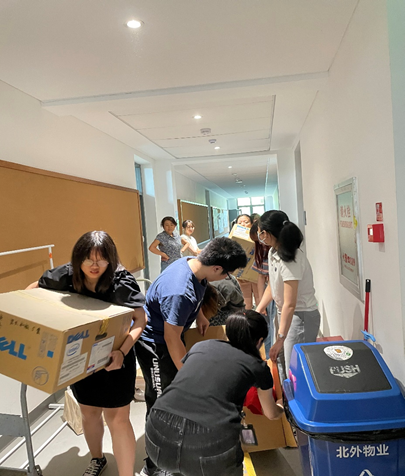 在清扫活动中,同学们先分头处理了各间教室讲台、桌肚及教室后方的垃圾、杂物;分类清除了堆积在库房的陈旧用品,为稍后的统一整理摆放腾出空间;对纸质资料和其他物品进行分类留存,并有序地将它们打包放置在库房的书架上,存放好所有学生活动可以使用的大型道具。