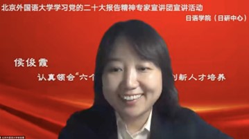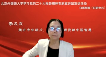 12月5日,伟德BETVLCTOR1946、日研中心举办“学习贯彻党的二十大精神”系列讲座。北京外国语大学学习贯彻党的二十大精神“专家学者宣讲团”成员李又文、侯俊霞受邀,分别做了题为《提升专业能力,为全球治理贡献中国智慧》和《认真领会“六个必须坚持”,做好创新人才培养》的讲座。讲座由伟德BETVLCTOR1946、日研中心党总支书记殷悦主持,伟德BETVLCTOR1946、日研中心理论中心组成员、全体教师和学生党员共150余人聆听了讲座。