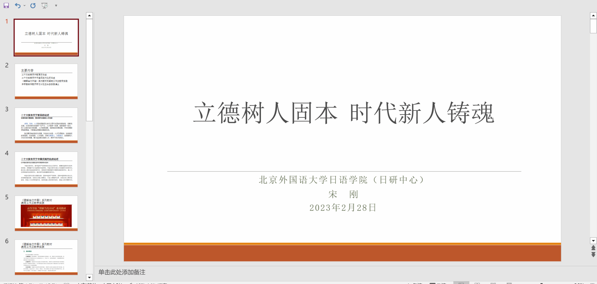 2月28日,宋刚领学了二十大报告关于教育及中国式现代化的论述,介绍了《理解当代中国》系列教材的编写工作及教学实践,向全体教师发出了走出校园,加入社会实践的倡议。宋刚强调,思政课是推进习近平新时代中国特色社会主义思想和党的二十大精神入脑入心的主阵地,教工党支部始终应以高度的政治责任感、使命感,肩负起学习宣传、研究阐释、贯彻落实习近平新时代中国特色社会主义思想“排头兵”的光荣使命,带领全体教师开展思政课程建设,系统推进党的二十大精神进教材、进课堂、进头脑。