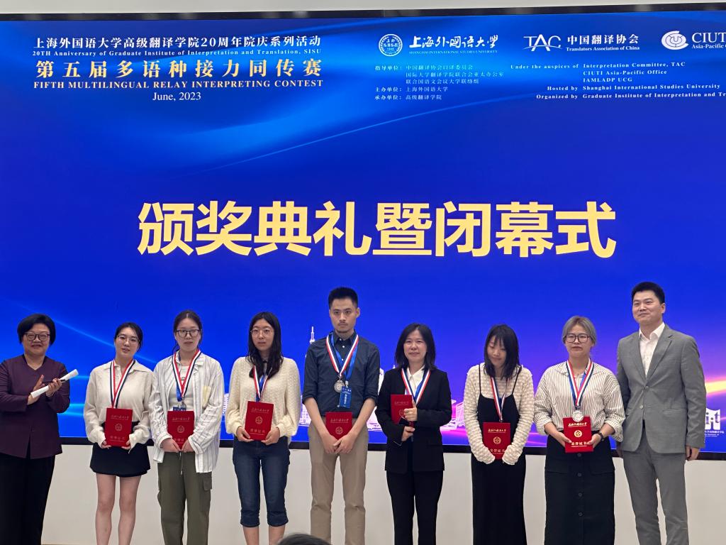 2023年6月2日,上海外国语大学第五届多语种接力同传赛决赛在上海外国语大学举行。伟德BETVLCTOR1946日语MTI口译方向22级韩露荷、孔维岳、刘光一、于航四位同学通过线上初赛,在宋刚老师的带队指导下,代表我校参加中日组决赛。其中,孔维岳同学正值日本留学期间,专程飞到上海参赛,最终荣获中日组二等奖;韩露荷、刘光一、于航三位同学获得优秀奖。
