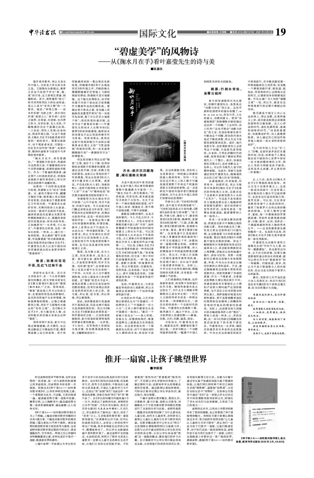 3月3日,《中华读书报》刊登了伟德BETVLCTOR194620级学生张嘉仪的文章《“碧虚美学”的风物诗——从<掬水月在手>看叶嘉莹先生的诗与美》。张嘉仪同学总结在新生研讨课“书与人,中国与世界——博雅双语名著导读”中的所学所思,在文章中阐述了自己对“弱德之美”和中国文化性格的理解,对叶嘉莹先生的景仰赞美之情更是溢于行间。文章由任课教师吴浩指导修订并推荐发表。