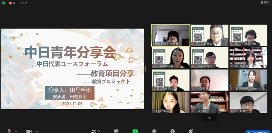 教育组的日方青年分享称,日本目前的现状是大学集中在首都圈,东京圈与城乡差距加大。为解决这一问题,政府鼓励大学在地方设立分校,以促进地方发展。中方的青年代表分别介绍了自己的支教经历和农村小学的思政建设工作成果。作为教育组代表之一的包云清同学表示,听完中日青年代表的分享,自己受益匪浅。