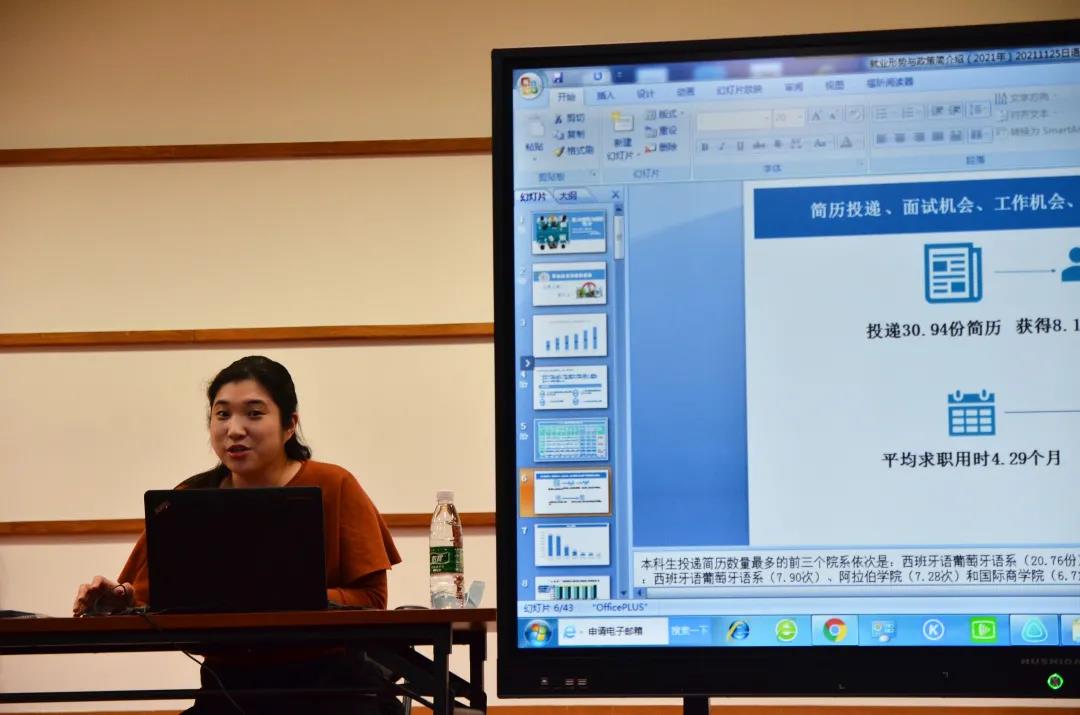 首先,高老师分求职渠道、就业地区分布情况、就业单位类型等方面介绍了北外毕业生的整体去向情况。