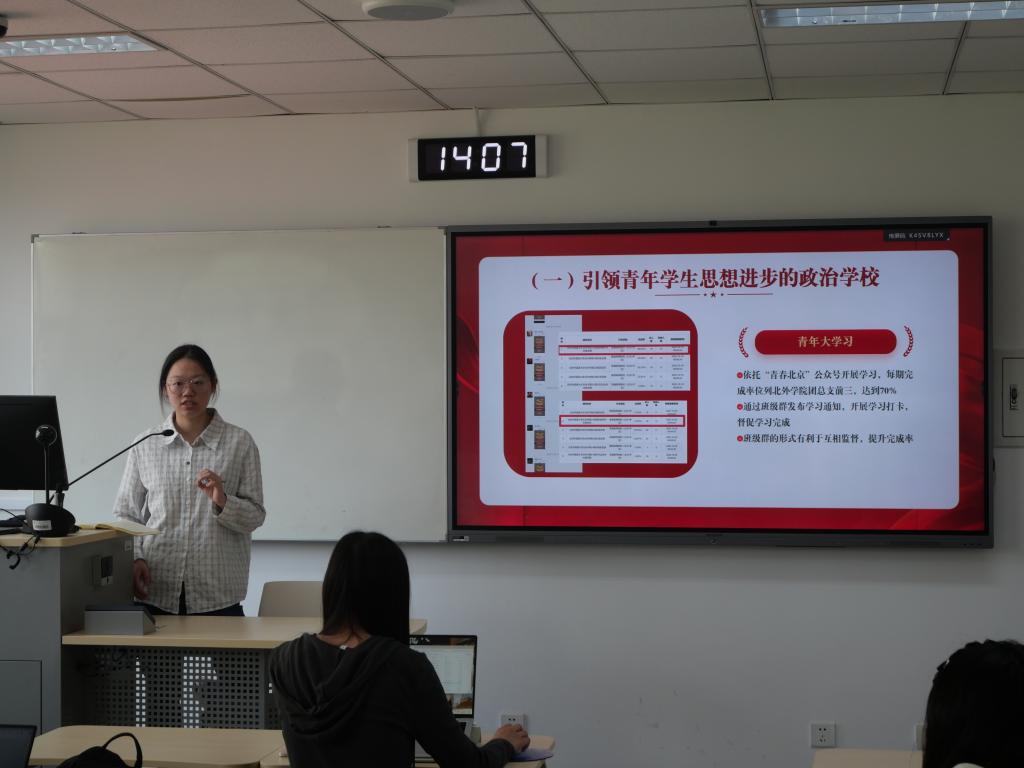 罗荔馨同学就四个方面进行了经验分享。支部建设方面,她提出要高度重视青年大学习,呼吁团支书们参照“活力团支部”评优标准,高要求、高质量地完成日常工作。团日活动方面,她强调要将其与学院、学校的活动接轨,对活动形式进行创新。三会两制一课方面,她指出要灵活组织讲授团课。服务支部成员方面,她认为要以支部成员为中心,结合学院培养目标,拓展同学们的国际视野。
