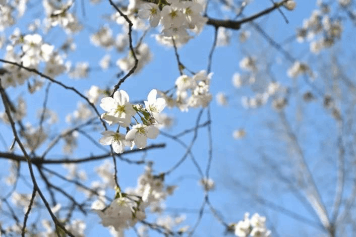 樱花树舒展纤细的枝条,澄澈蓝天为幕,洁白的樱花簇拥绽放。春日暖阳洒落,为花瓣镶上柔和的光晕,每一朵樱花尽显春日的盎然生机。