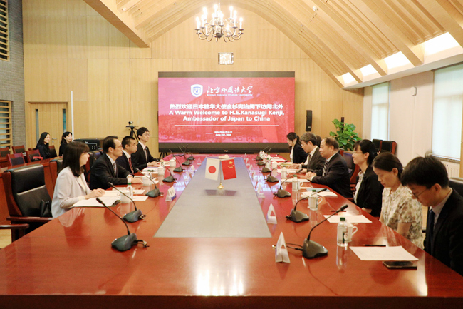 6月21日,日本国驻华大使金杉宪治访问北京外国语大学。北外党委书记王定华会见金杉宪治一行。