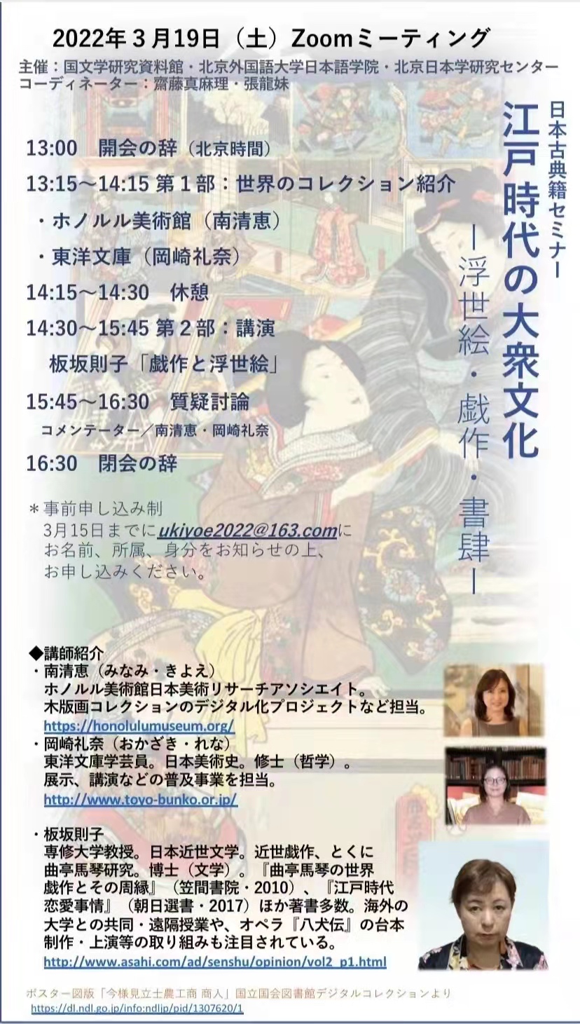 北京日本学研究中心于2007年12月与日本国文学研究资料馆签订了学术交流协议,2017年12月开始的第3个5年计划中,增加了每年在日研中心举办学术讲座的合作内容。迄今已举办了3次讲座(2020年因疫情停办一次)。讲座选题力求结合日研中心学生的研究课题,同时兼顾国内日本学研究的动向。今年的讲座定于3月19日,讲座主题考虑到近年的浮世绘热而设定。