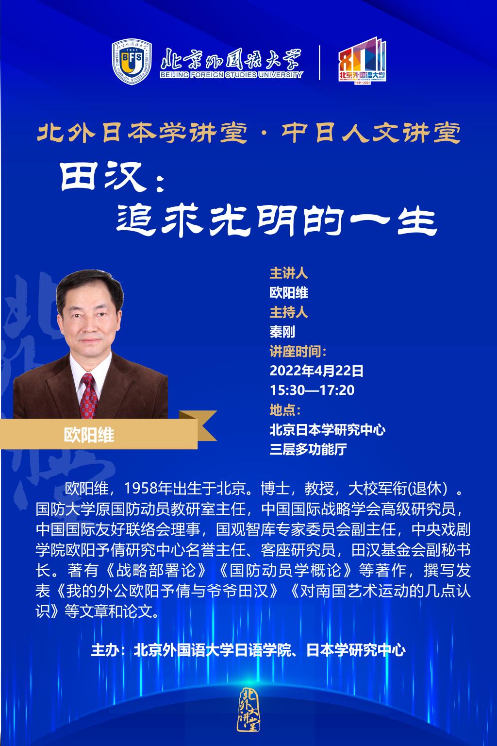2022年春季学期,伟德BETVLCTOR1946、日本学研究中心继续隆重推出“中日人文讲堂”系列讲座。“中日人文讲堂”将邀请国内外专家学者以“人”为主体,聚焦中国与日本之间具有历史意义的文化实践、思想交互以及人文交流展开系列学术讲座。本学期第二场讲座将于2022年4月22日15:30-17:20在日本学研究中心三层多功能厅进行。本次讲座特别邀请国防大学教授欧阳维担任主讲人,讲座题目为“田汉:追求光明的一生”。