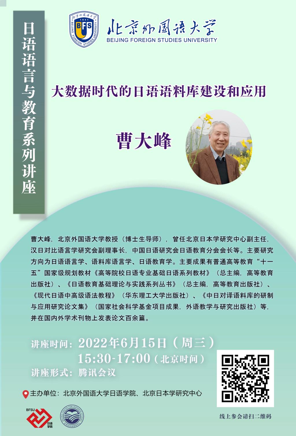 “日语语言与教育系列讲座”第五讲:大数据时代的日语语料库建设和应用,主讲人为北京外国语大学教授(博士生导师)曹大峰,主持人为北京外国语大学朱桂荣老师,相关信息详见下方海报。